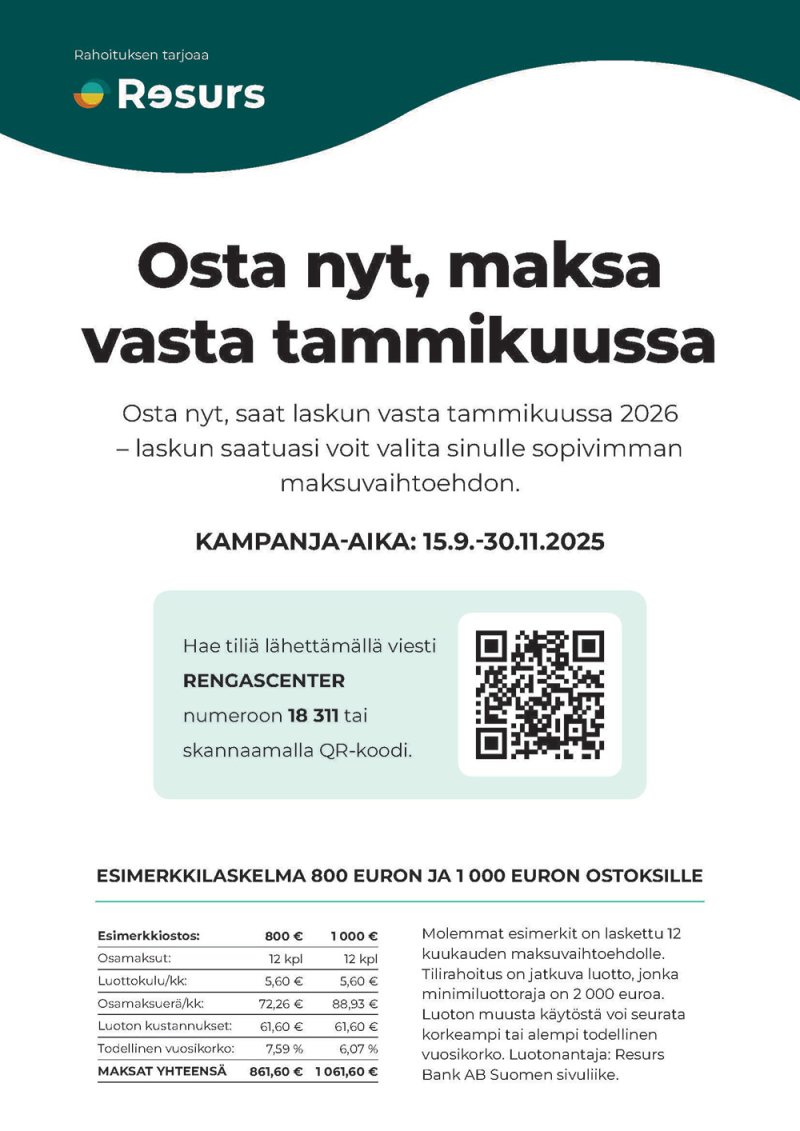 Tekemällä loppuvuoden hankinnat RengasCenter-tilillä 15.9.-30.11., saat laskun vasta tammikuussa 2026. Laskun saatuasi voit valita itsellesi sopivimman maksuvauhtoehdon.